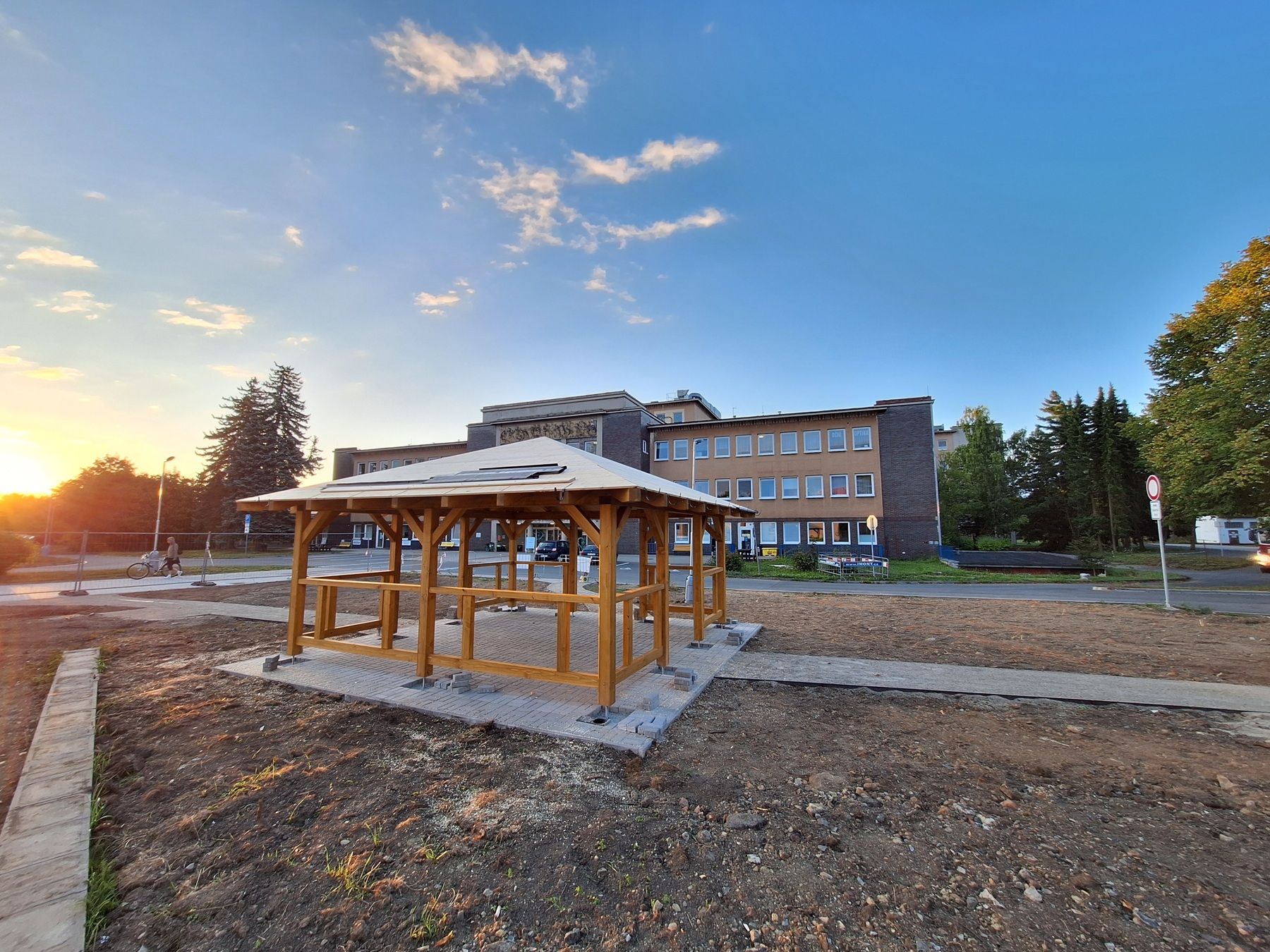 Před nemocnicí tak vzniká parčík s mlatovými cestami. „Jeho hlavní dominantou bude dřevěný altánek s lavičkami a socha Žena s hrozny, která dosud stála z boku nemocnice. Nyní se dočká nejen opravy, ale bude i na mnohem důstojnějším místě. V parčíku se instalují podél cest i další lavičky a na podzim a dále na jaře je doplní i výsev trávy a výsadba nových parkových dřevin a květin. Cílem je, aby příchozí pacienti nebo návštěvy mohly na chvilku posedět, odpočinout, pohovořit se známými v příjemném venkovním prostředí,“ doplnila Štancová.