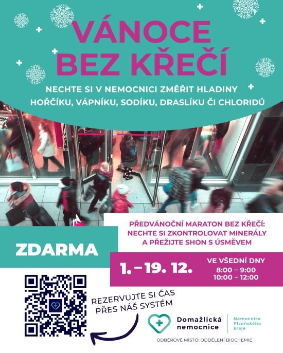 Chcete prožít VÁNOCE BEZ KŘEČÍ, stresu a únavy? Samozřejmě záleží na tom, jaké nároky na sebe během adventu kladete a jak snadno nebo těžce je dokážete plnit. Vaše rozpoložení nebo dokonce odolnost proti křečím ale ovlivňuje také zásoba některých látek a minerálů v těle. Oddělení klinické biochemie Domažlické nemocnice vám proto nabízí bezplatné vyšetření hladiny pěti důležitých prvků a konzultace, jak jejich případný nedostatek ovlivňuje vaše zdraví a jak chybějící látky doplnit. Do preventivní akce VÁNOCE BEZ KŘEČÍ se můžete zapojit v Domažlické nemocnici od 1. do 19. prosince.